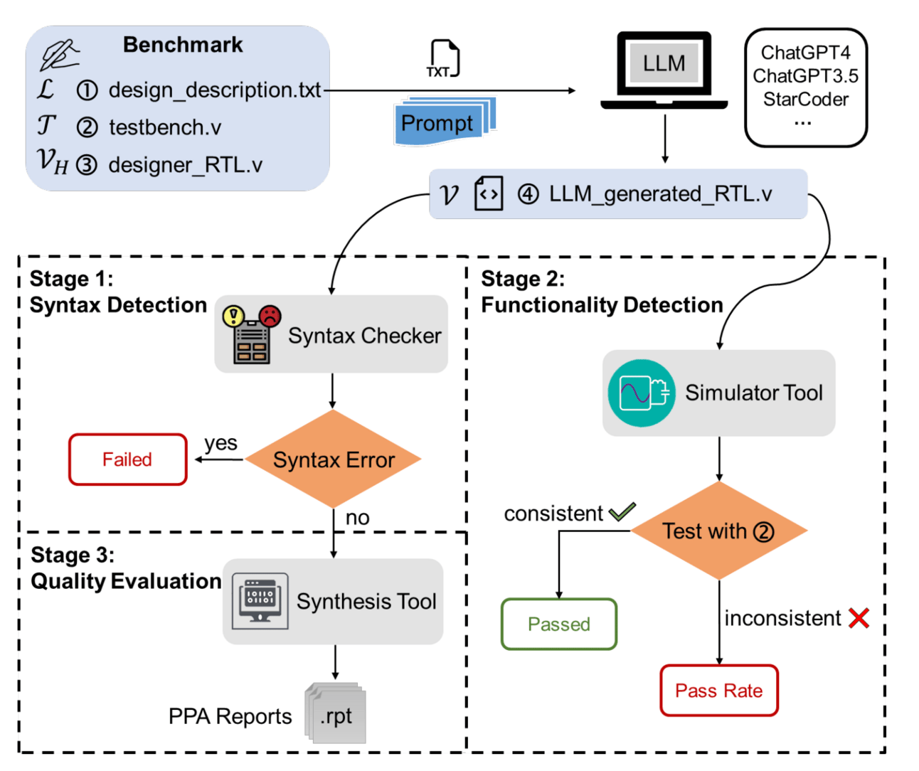 VerilogEval: Evaluates LLM-generated Verilog code to ensure correctness, efficiency, and performance.